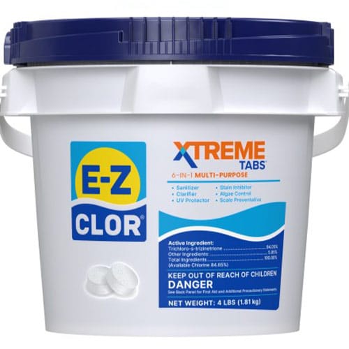 Simplify pool care with EZ Clor Xtreme Tabs – 4 lb pail of 3″ chlorine tablets, an advanced 3-in-1 solution that not only sanitizes your pool water but also clarifies and adds stain and scale protection.