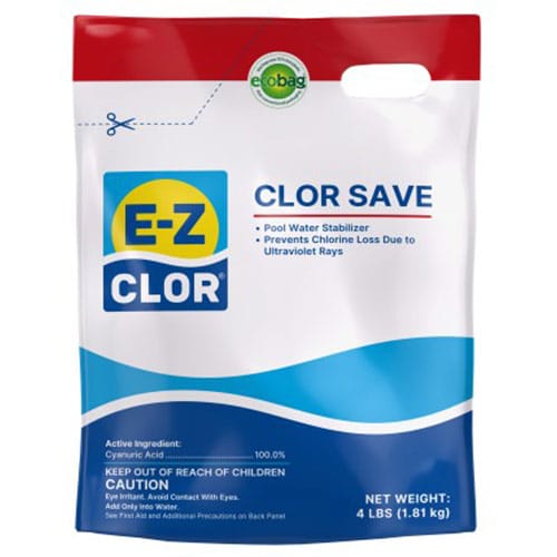 Maximize your chlorine’s performance with EZ Clor Clor Save Stabilizer – 4 lb pouch, specially formulated to protect pool chlorine from rapid UV degradation. Also known as cyanuric acid, this stabilizer helps reduce chlorine loss caused by sunlight, keeping your sanitizer effective longer and reducing chemical usage.
