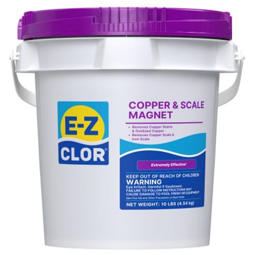 Protect your pool from damaging scale and unsightly metal stains with E-Z Clor Copper & Scale Magnet – 10 lb pail. This powerful formula is specially designed to sequester dissolved metals such as copper, iron, and manganese, while also preventing calcium scale buildup on pool surfaces and equipment.