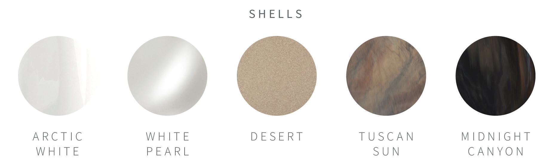 Arctic White, White Pearl, Tuscan Sun, Midnight Canyon, or Desert